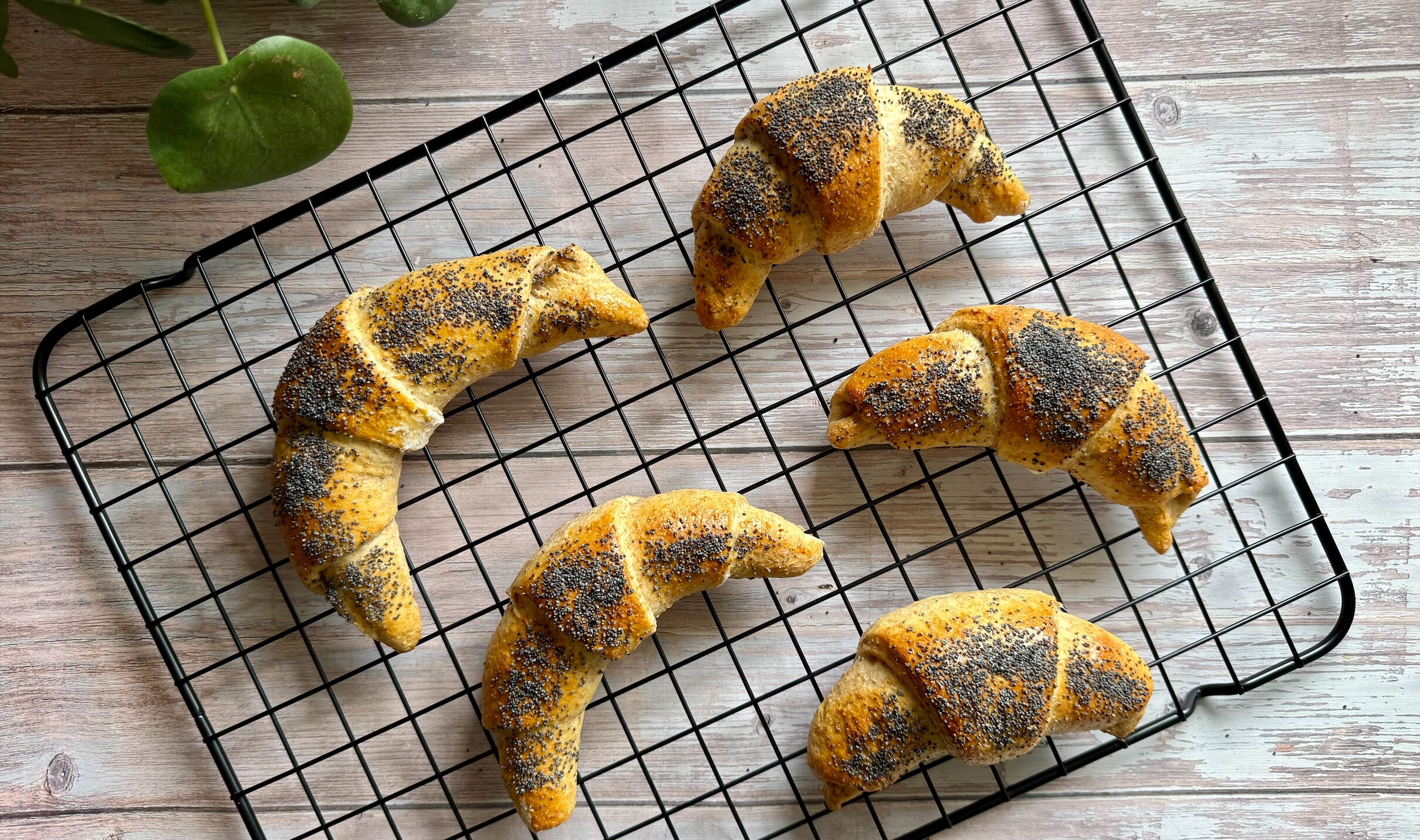 Frokost og lunsj Kaker og bakst Over 60 min Middels Horn fylt med skjørost og spekeskinke Disse skinkehornene med skjørost og spekeskinke er en skikkelig god kombo. Passer perfekt til frysing og matpakka. Slik gjør du Smuldre gjær i en bakebolle. Smelt Røros Smør, ha i Helmjølk og la blandingen bli temperert. Rør ut gjær i væsken. Ha i salt, sukker og mel. Elt deigen i kjøkkenmaskin i omtrent 10 minutter. Sett deigen lunt og la den heve til dobbel størrelse. Ha deigen over på melet overflate, og del opp i to emner. Kjevle ut hvert emne til en flat, rund leiv. Del opp leiven i trekanter. Legg på fyllet i den brede enden. Rull sammen fra den brede enden og inn mot spissen. Legg over på stekebrett og bøy dem litt slik at de får ønsket form. Etterhev i ca 30 minutter. Pensle med egg og strø på valmuefrø før steking. Stek på midterste rille i stekeovnen på 225 grader i ca. 15 minutter. Husk på at alle ovner er ulike, så det kan være lurt og følge litt ekstra med de siste minuttene av steketiden. Avkjøl på rist. Produkter brukt i denne oppskriften Alle produkter Økologisk Syrna Naturell Økologisk Røros Smør™ 1 % Havsalt Økologisk Helmjølk 4 % fett Se flere fristende oppskrifter Alle oppskrifter Smakfull skjørostkrem toppet med rødbeter og hasselnøtter Enkle bagels med skjørost Enkel og rask ripskake