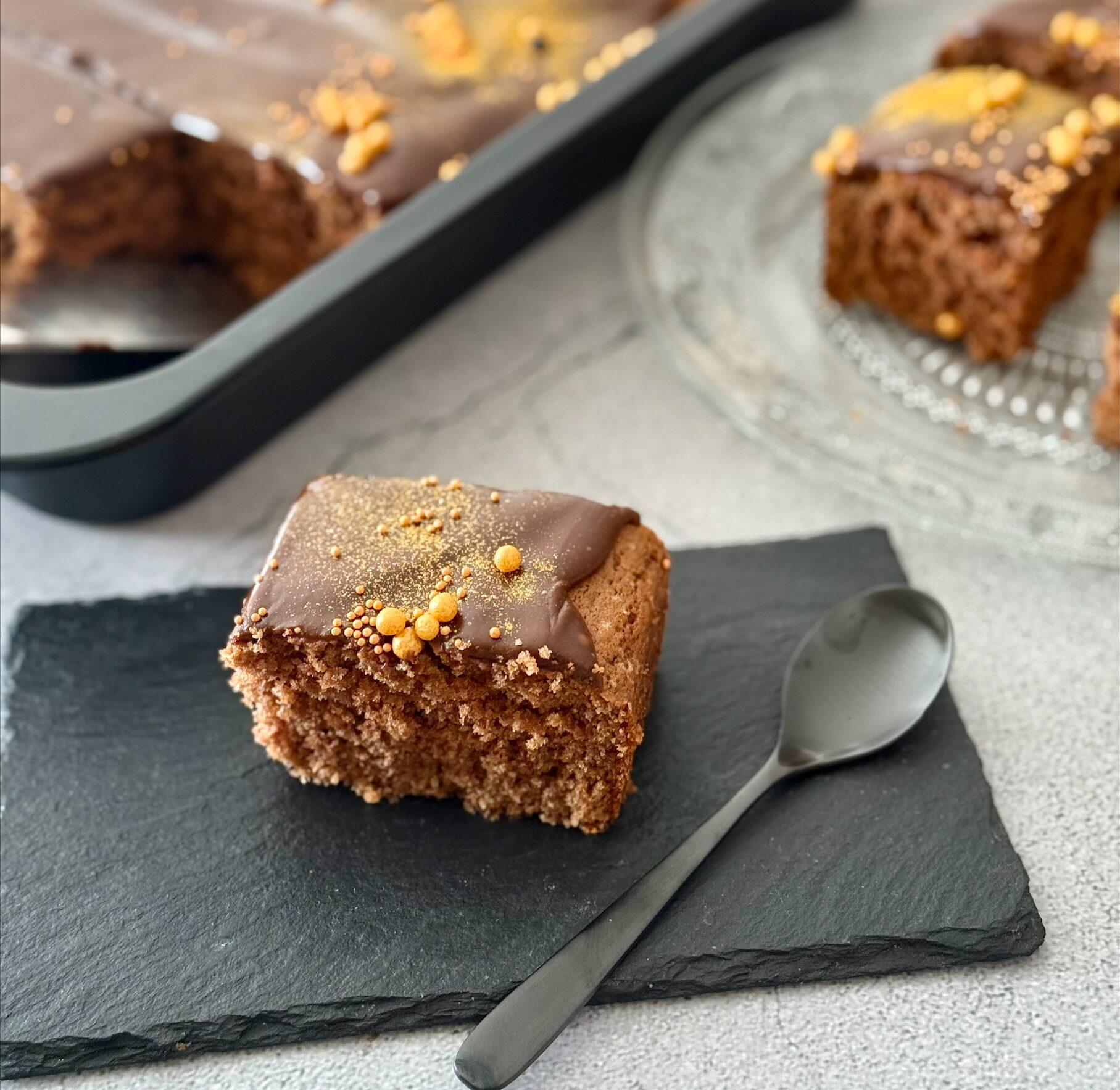 Oppskrift på saftig langpannekake med masse sjokoladekrem. Denne kaken er ekstra saftig og luftig på grunn av den syrna mjølka.