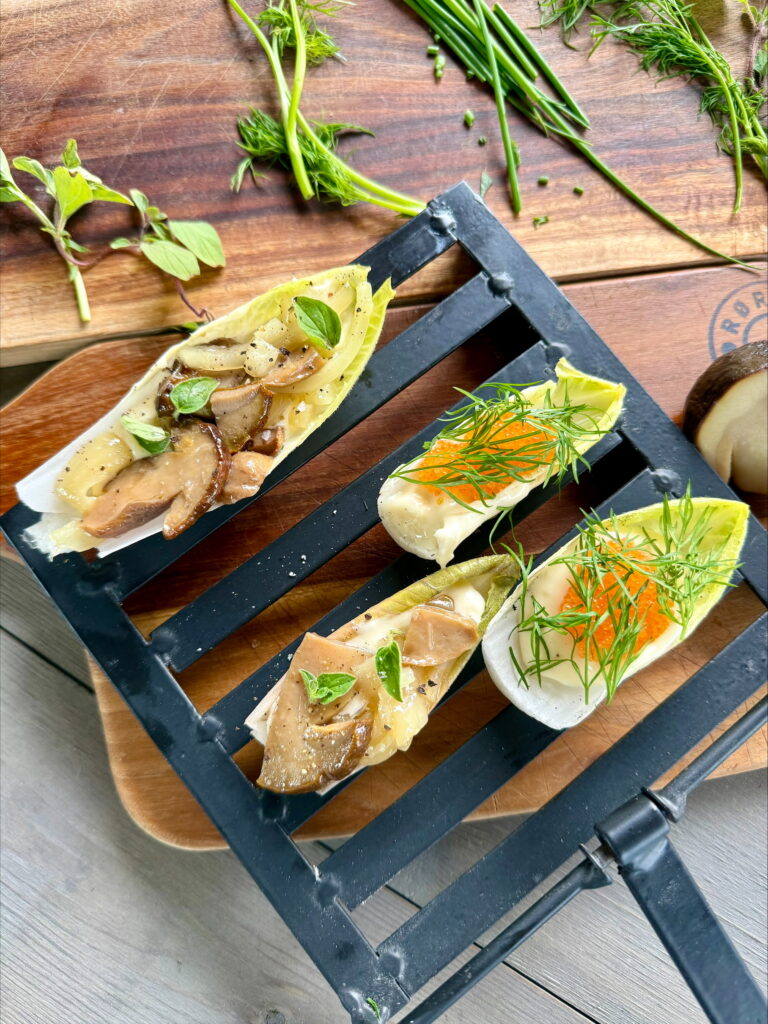 Grillet endive med ostesaus og confitert stensopp