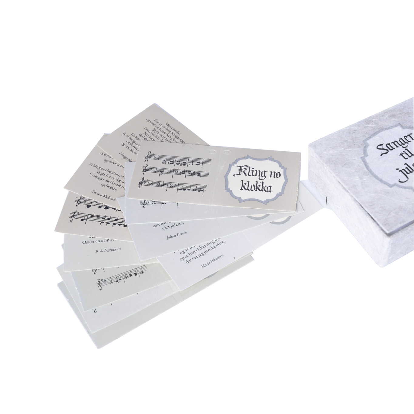 Hver sang kan henges på juletreet og fungerer både som pynt og huskelapp når julesangene skal synges. Hver boks har 12 hefter med julesanger. Både til sang og fin pynt.