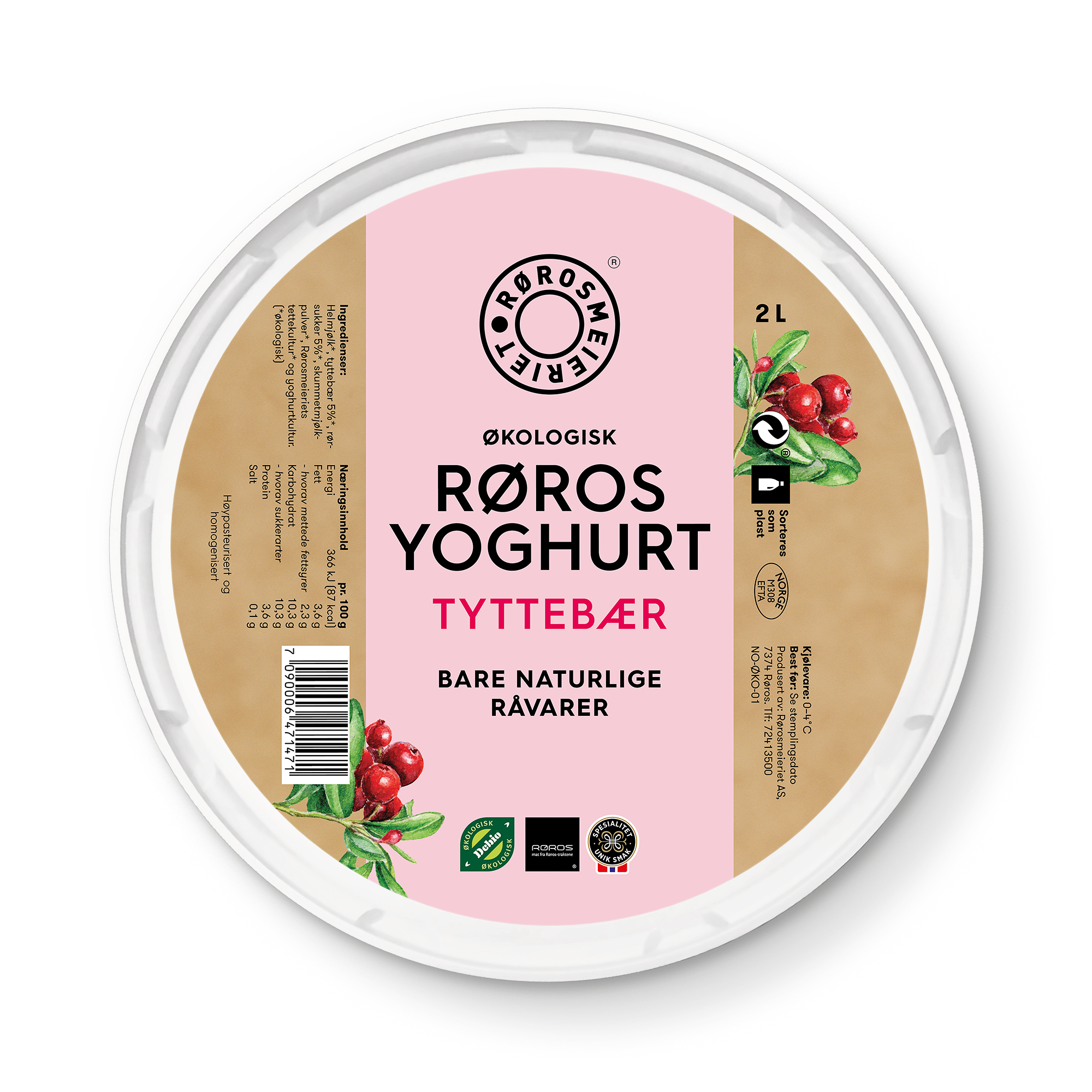 Vår egen yoghurt er en norsk økologisk yoghurt med mild, frisk og fyldig smak. Røros Yoghurt Tyttebær har en mild og søt smak av tyttebær.